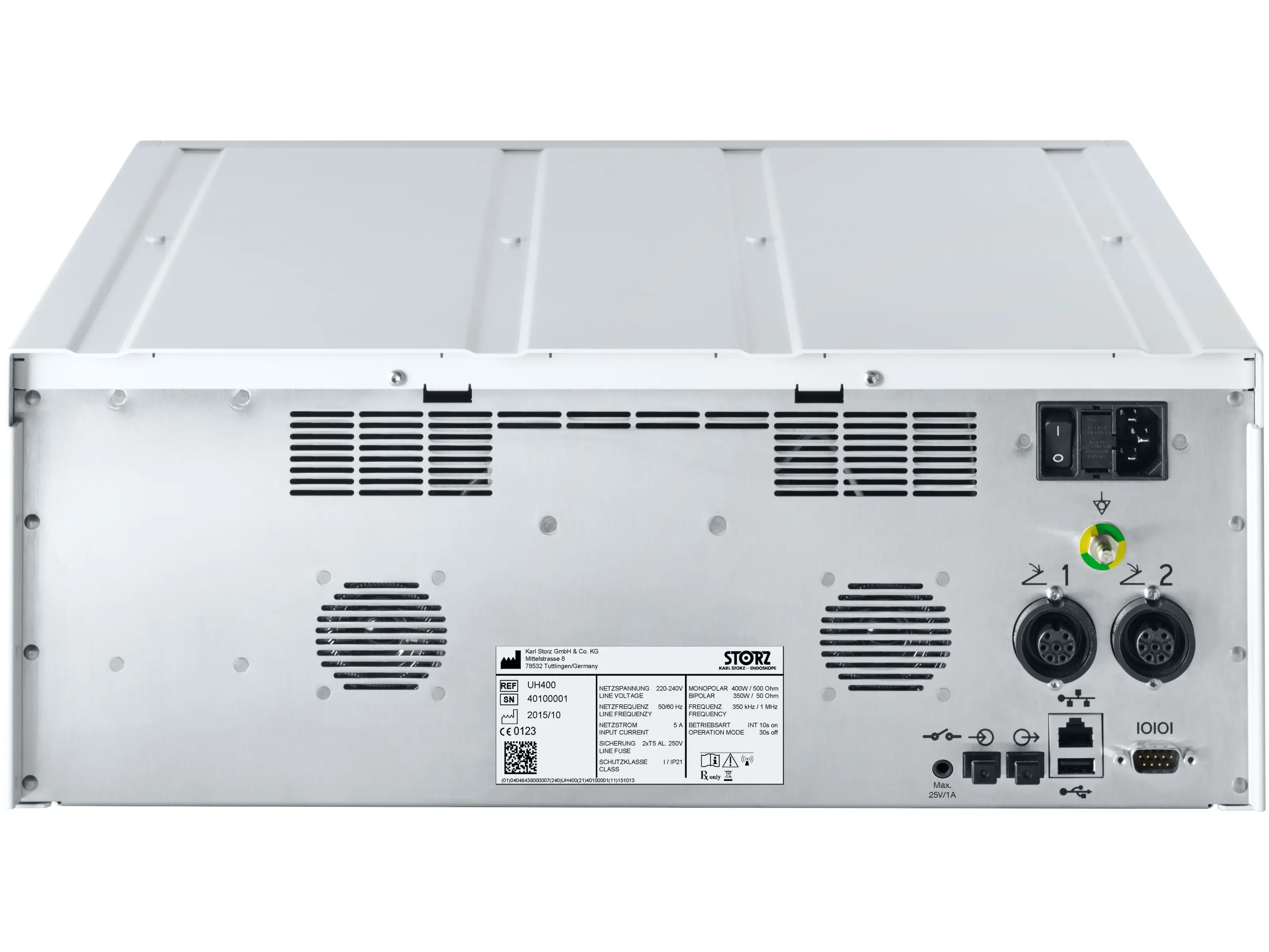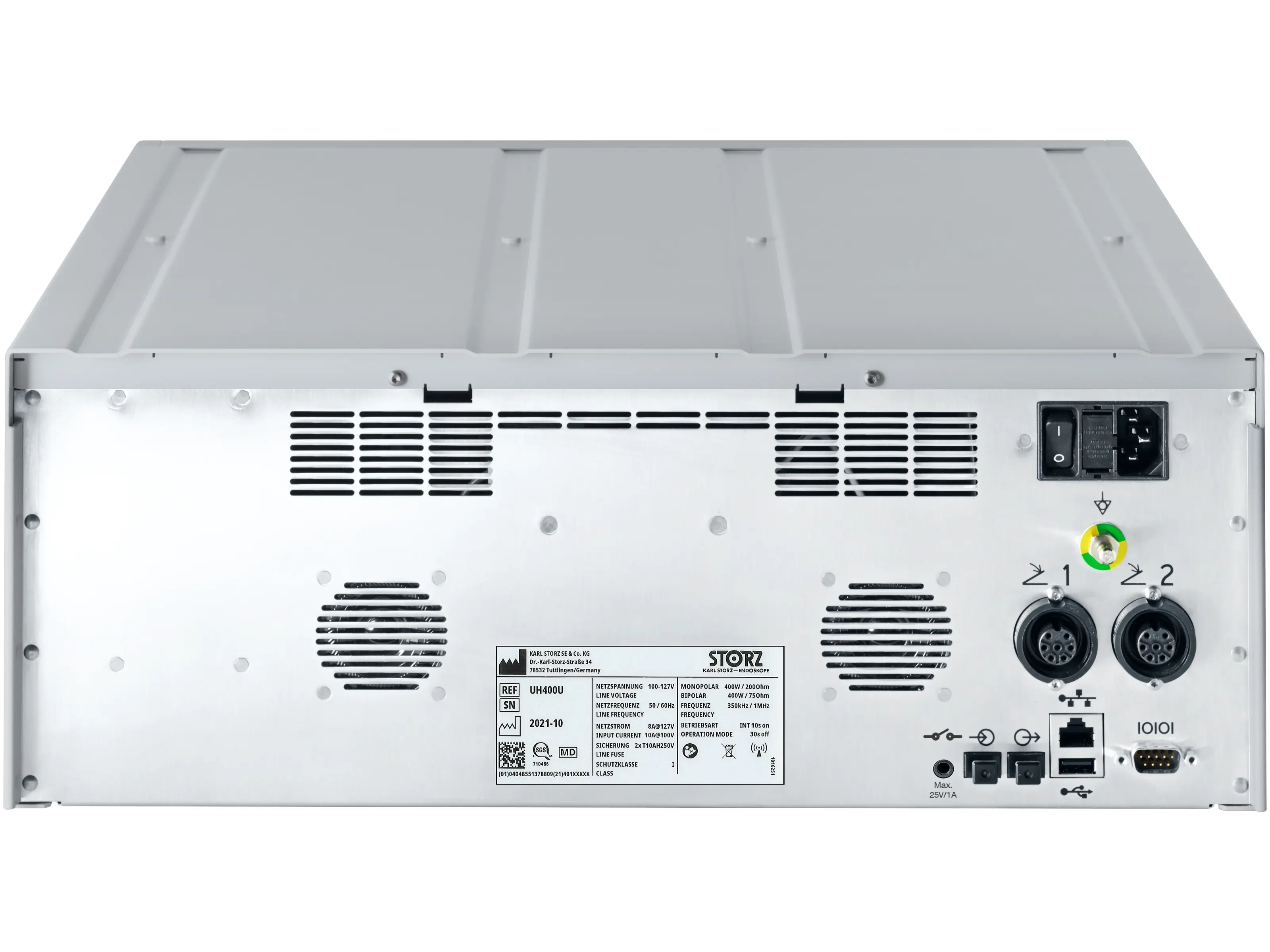 | Anschlussbuchse für unipolare Instrumente | 2x 3-Pin US-Typ-Buchse, 2x 4-mm-Buchse (fußgeschaltet), 1x 5-mm-Buchse KARL STORZ, 1x 8 mm BOVIE (fußgeschaltet) |