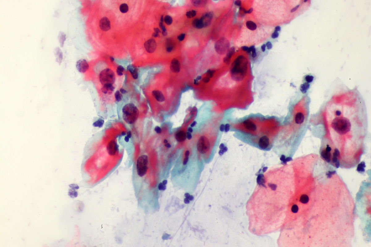 Eosinophilic, moderately mature dyskaryotic squamous epithelial cells in a 29-year-old patient. Colposcopic examination showed an atypical T-zone type 2 with major change and CIN 2 on biopsy.