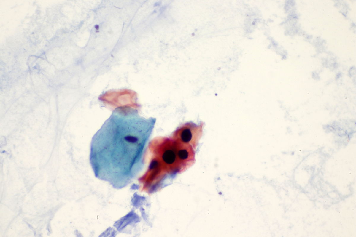 Eosinophilic, mature dyskaryotic cells and koilocytes of squamous epithelium in a 31-year-old patient. Colposcopic examination showed an atypical T-zone type 1 with minor change and CIN 1 on biopsy.