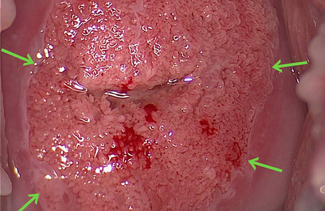 Following application of acetic acid, aceto-white columnar epithelium borders directly on squamous epithelium, the major features of a normal transformation zone. In this adolescent, the squamocolumnar junction indicated by green arrows is identical with the congenital junction.
