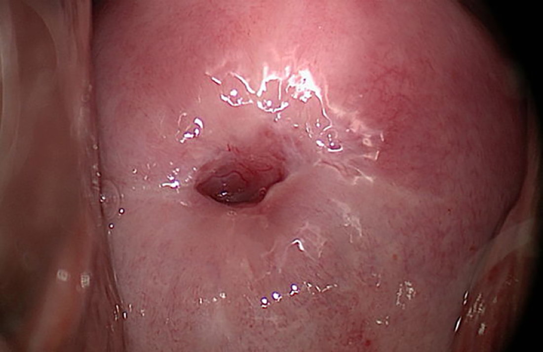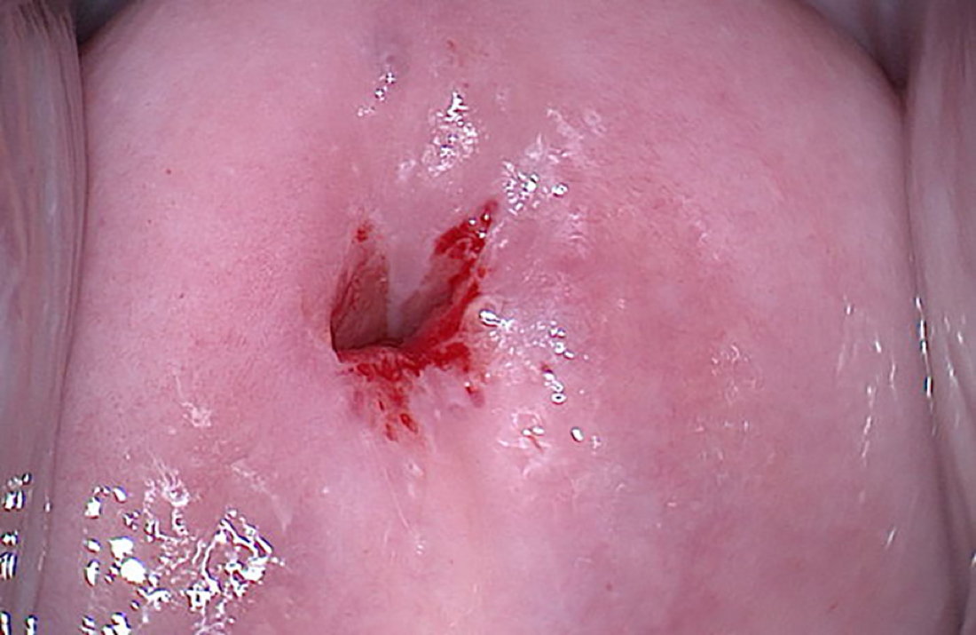 The adult or functional squamocolumnar junction is fully visible and a small tongue of squamous epithelium expands into the cervical canal at 12 o’clock.