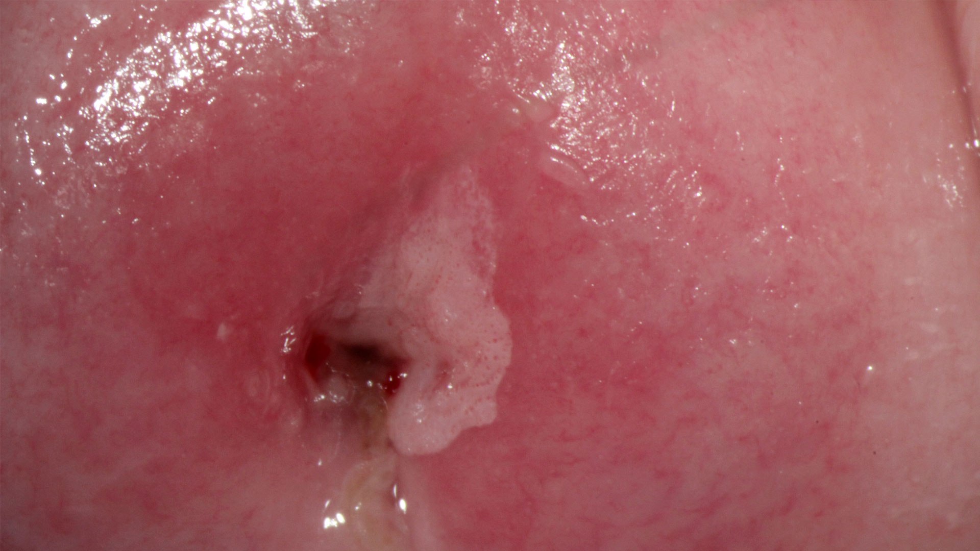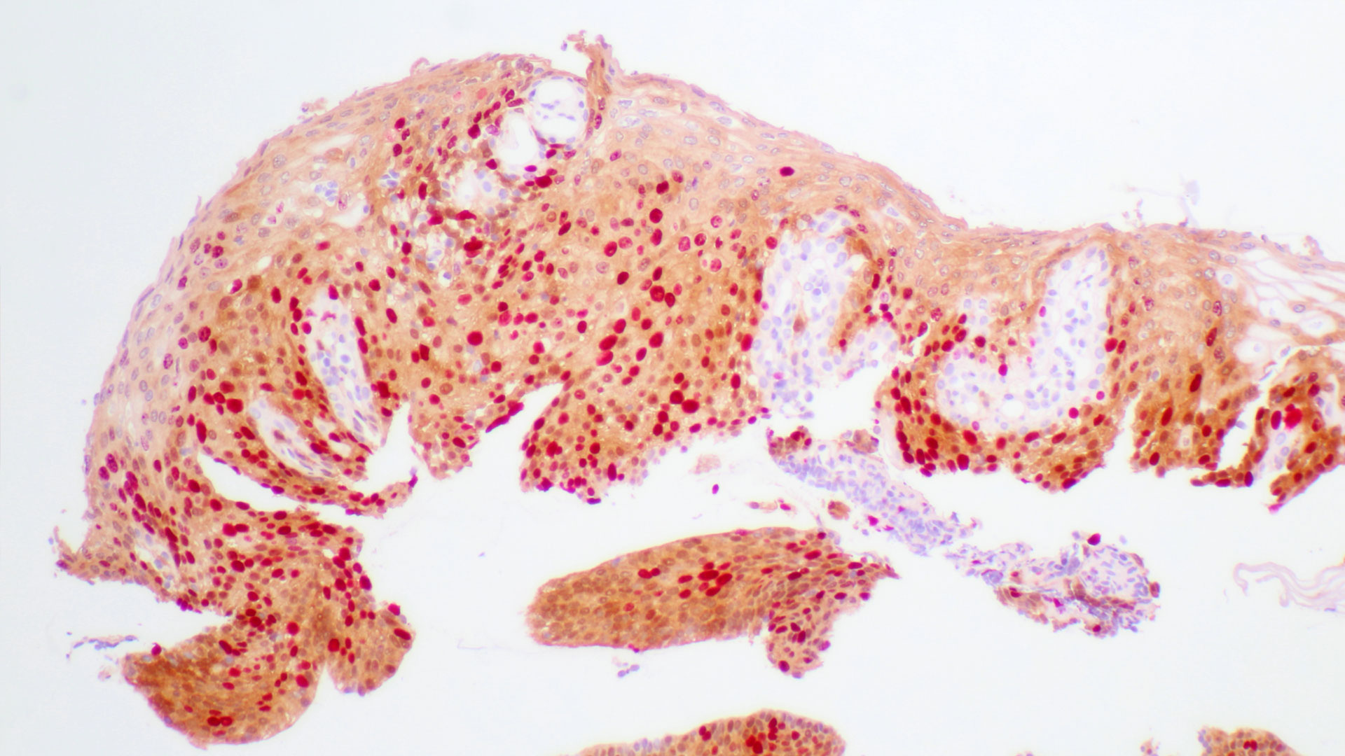 Histopathology of tissue sampled by punch biopsy from the opaque acetowhite lesion at 3 o’clock shows atypical cells that express high concentrations of the Ki67 marker into the middle third of the epithelium and of p16 into the upper third of the epithelium. The stromal papillae and rete pegs are clearly visible and are the histological reflection of the colposcopic phenomenon ‘punctation’. The diagnosis is grade 2 cervical intraepithelial neoplasia