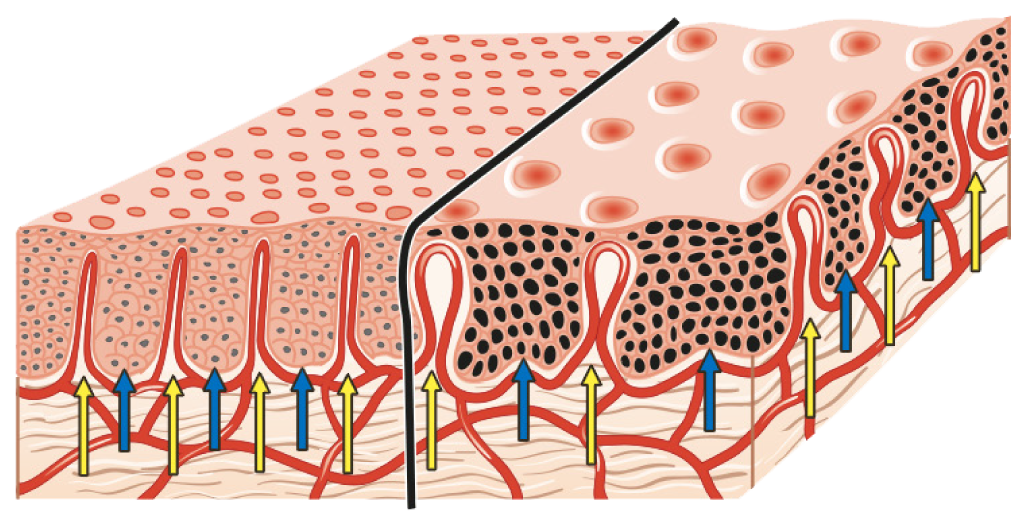 The diagram shows the morphologic basis for the colposcopic finding of punctation. The stromal papillae (yellow arrows) are interposed between the rete pegs (blue arrows) of the epithelium. Inside the stromal papillae, capillary vessels form loops that closely approach the epithelial surface, where they appear as separate red dots. When viewed from above, the capillary loops form a stippled pattern that colposcopists call ‘punctation’. HSIL (right) differs from LSIL (left) in that the rete pegs in neoplastic tissue are widened, causing the dots to be spaced farther apart.
