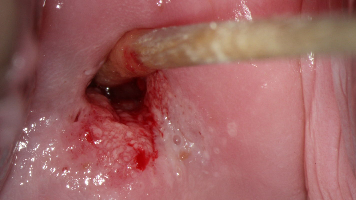 Colposcopy shows a peripheral acetowhite lesion between 10 and 12 o’clock in an atypical T-zone type 2, which is classified as a normal colposcopic finding.