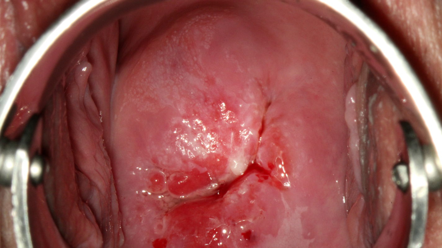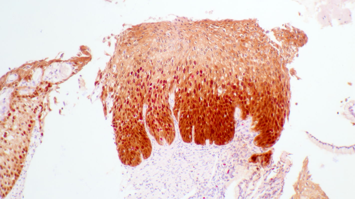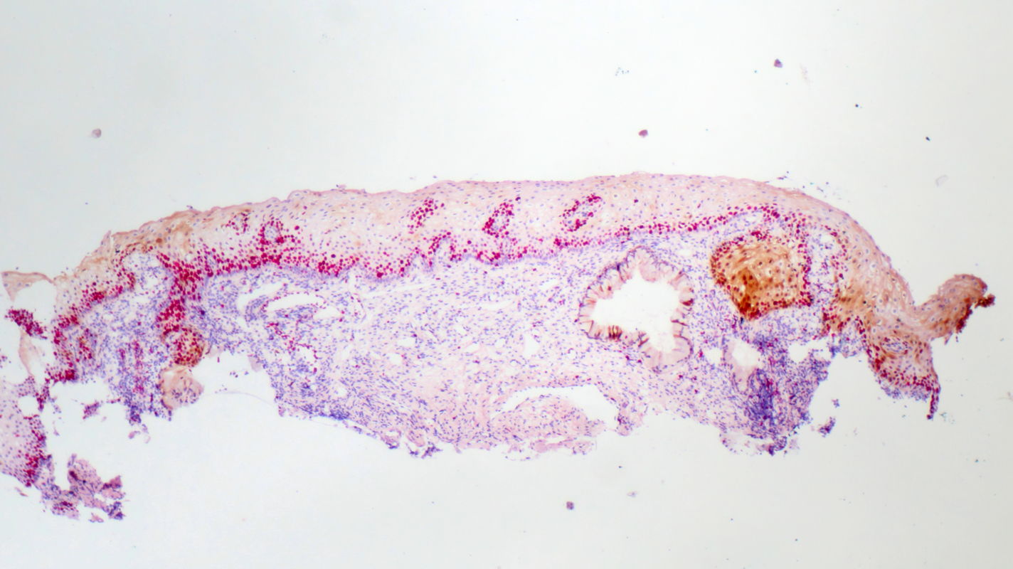 Histopathology of tissue sampled by punch biopsy from the opaque acetowhite lesion at 6 o’clock shows atypical cells that express high concentrations of Ki67 marker into the middle third of the epithelium and of p16 marker into the upper third of the epithelium. The stromal papillae and rete pegs are clearly visible with reflect histologically the colposcopic phenomenon ‘mosaic’. Diagnosis is grade 2 cervical intraepithelial neoplasia (CIN 2).