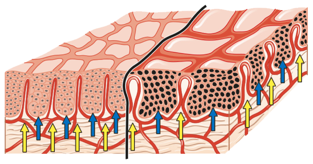 The diagram shows the morphologic basis for the colposcopic finding of mosaic. The stromal papillae (yellow arrows) are interposed between the rete pegs (blue arrows) of the epithelium. Inside the stromal papillae, capillary vessels form loops that rise close to the epithelial surface, where they appear as individual lines. When viewed from above, the capillary vessels form a crisscross pattern that colposcopists call ‘mosaic’. HSIL (right) differs from LSIL (left) in that the rete pegs in neoplastic tissue are widened, causing the vessels to be spaced farther apart.