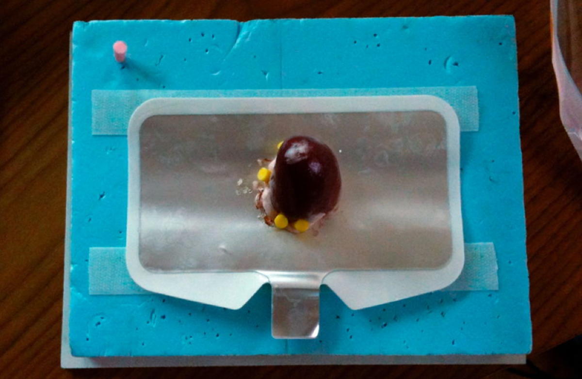 The training specimen is shown in panel. A turkey heart, which is similar in size and shape to a human cervix, has been positioned on a monopolar electrode.