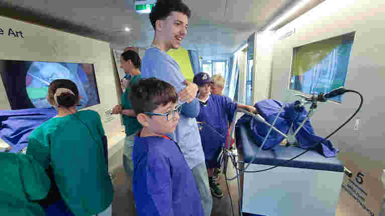 Die OR1-Sonderausstellung von KARL STORZ öffnete darüber hinaus die Tür zu einem hochmodernen Operationssaal und regte den Nachwuchs zum Nachdenken an: Wie wird sich die Chirurgie weiterentwickeln? Nach einer interaktiven Einführung in der neuen OR1-Ausstellung, die den Wandel der letzten 25 Jahre beleuchtete, erlebten die Kinder dann hautnah den Unterschied zwischen einem bisherigen und einem hochmodernen Operationssaal. „Wahnsinn, wie sich die Bildgebung verändert und weiterentwickelt hat“, so ein Junge. In einem praktischen Experiment wagten die Kinder dann den direkten Vergleich zwischen einem traditionellen und einem Hightech-OP und führten eine spielerische Operation an einer Puppe durch und dokumentierten ihre Erkenntnisse. Ihre kreativen Zukunftsvisionen wurden anschließend auf Papier gebracht: Wird die Chirurgin oder der Chirurg von morgen mit VR-Brille operieren? Steuert künstliche Intelligenz den Eingriff? Die gezeichneten Entwürfe zeigten aufregende Ideen und wurden im Behandlungsraum präsentiert. Alles in allem löste der OP-Workshop bei den Kindern eine große Begeisterung aus.