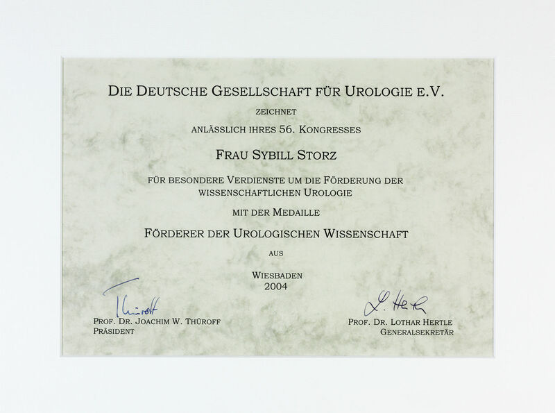 Сибилл Шторц получает медаль Дизеля от Немецкого института изобретательства. Немецкое общество урологов (DGU) также награждает Сибилл Шторц за содействие развитию урологии.